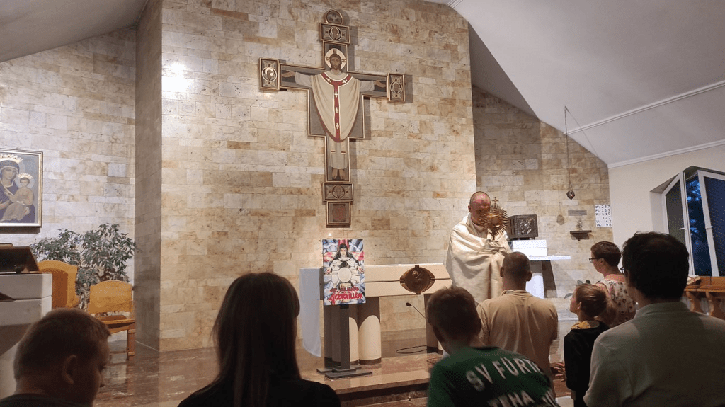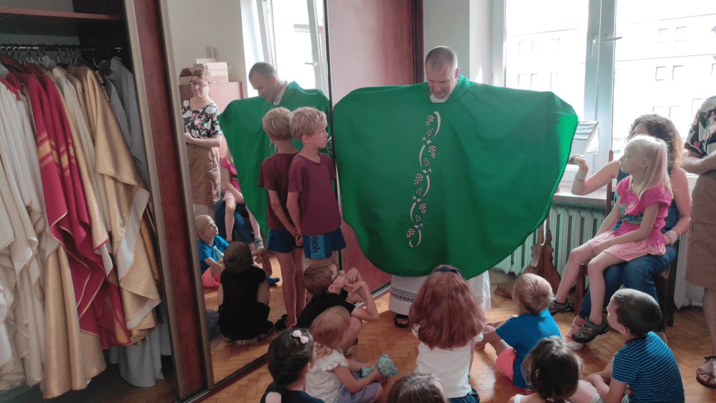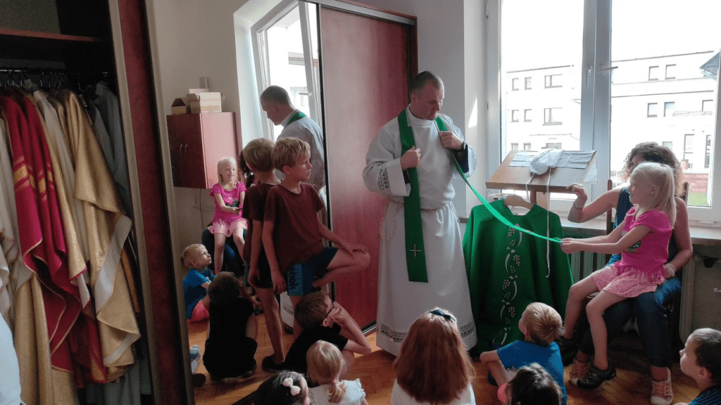 Podczas katechezy dla dzieci przedszkolnych i wczesnoszkolnych ksiądz otworzył drzwi do zakrystii. Dzieci mogły zobaczyć i dotknąć szat liturgicznych. Dowiedziały się, jakie znaczenie mają kolory ornatów i poznały naczynia liturgiczne, używane w czasie mszy świętej. Patronem dnia była święta, która swoją modlitwą ratowała dusze dla Jezusa. Podczas modlitwy wieczornej chcieliśmy pójść w jej ślady i przed Najświętszym Sakramentem odmówiliśmy koronkę do miłosierdzia Bożego, z którą związany jest odpust zupełny. Modliliśmy się w różnych językach europejskich: polskim, niemieckim, włoskim i hiszpańskim.